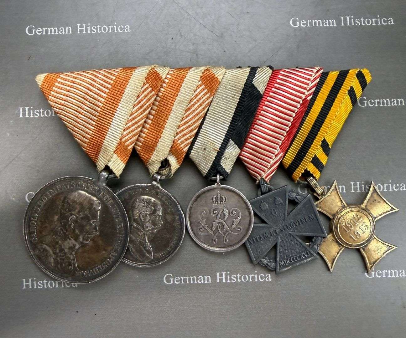 Die Spange ist zeitgenössisch montiert in typischer österreichisch-ungarischer Trageweise. Solche stimmigen Ordensspangen mit der preußischen Krieger-Verdienstmedaille für Nichtpreußen sind sehr selten zu finden.