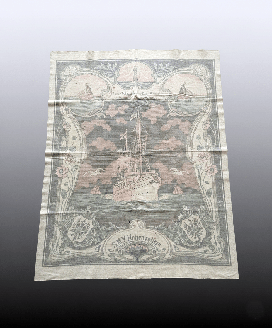 Das Jacquard-Gewebe zeigt Motive der kaiserlichen Marine unter Wilhelm II. Neben dem Leitspruch „Unsere Zukunft liegt auf dem Wasser“ ist der Name S.M.S. Hohenzollern eingewebt. Die Ausführung ist in den Zeitraum ab 1898 einzuordnen. Eine eindeutige Zuordnung zur Bordausstattung der Yacht ist nicht möglich, aber sehr wahrscheinlich entweder als Liegestuhlauflage oder als Geschenk für Gäste an Bord der Yacht.